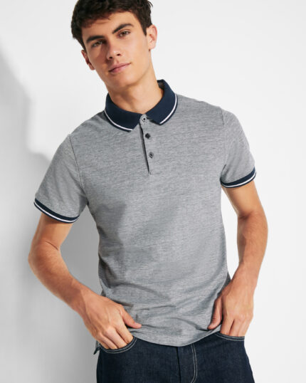 Polo Vigoré de manga corta. Cuello y bocamangas en color solido con canalé 1×1 y detalle decorativo a contraste. Tapeta