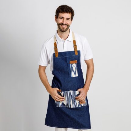 Delantal medio o corto, tipo denim vaquero con bolsillo central de corte asimétrico y cintas de espiga de algodón. Con