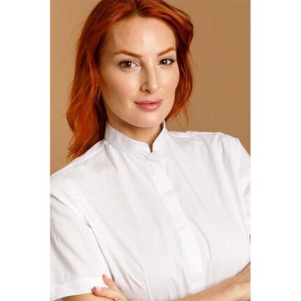 Blusa uniforme de mujer de manga corta. Moderna, con cierre central con bolsillos, entallada y sin bolsillos. Perfecta para vestir