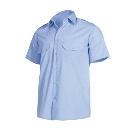 Camisa unisex de manga corta y cuello regulable. Con charreteras, tablón en la espalda, bolsillos con fuelles y tapetas y