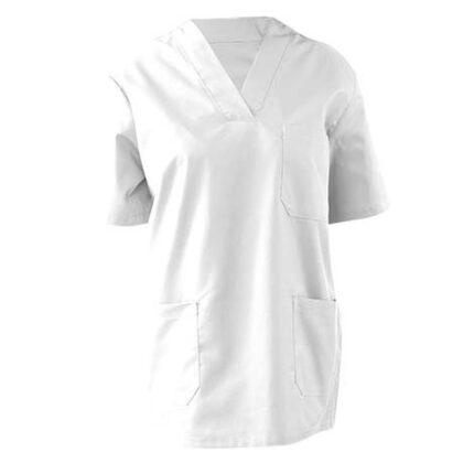 Casaca unisex, manga corta, cuello pico, 3 bolsillos y abertura laterales. Composición 65%poliéster, 35%algodón. Gabardina suave 195gr.