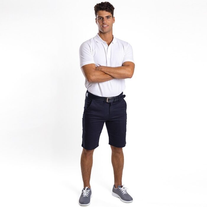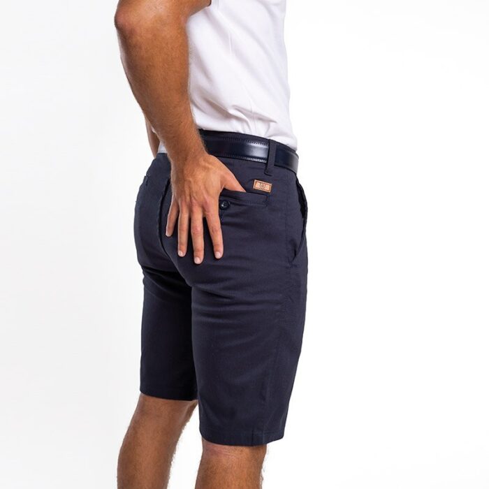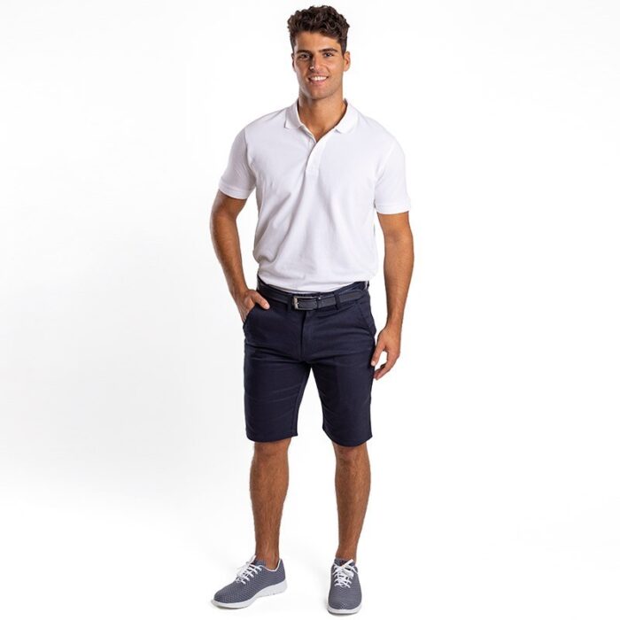 Bermudas para hombre en tejido stretch fresco, sin pinzas, bolsillo francés, 2 bolsillos traseros con botón. Composición: 97% algodón, 3% elastano. Gramaje: 200 gramos