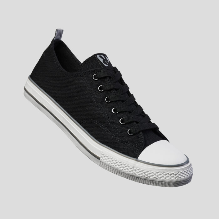 Zapatilla clásica en lona con suela de goma blanca decorada con líneas en color. Ojales laterales de ventilación, punta de goma y cierre de cordones.