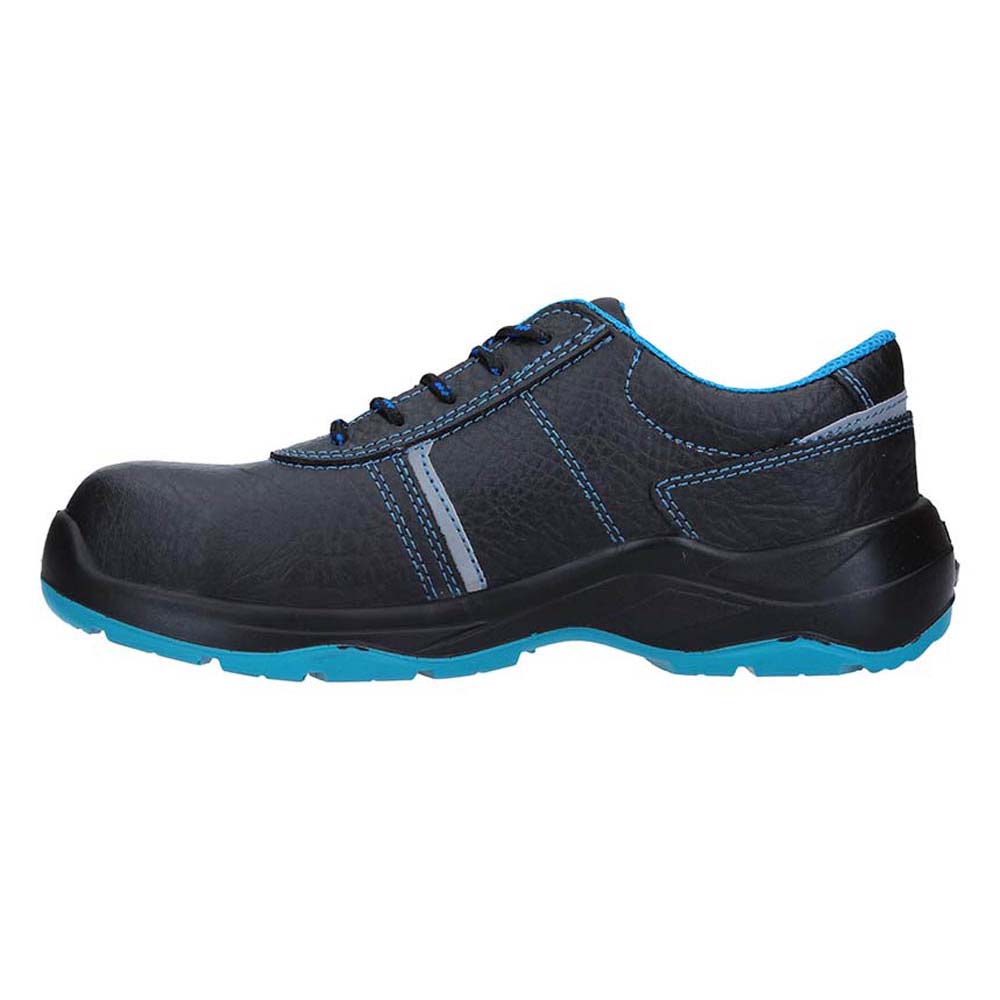 Zapato de seguridad Carbono negro de J’hayber Works. Calzado de seguridad negro con detalles azules, ligero y flexible, con horma ancha, lo que hace que sea un calzado cómodo para afrontar la jornada laboral. Su corte está realizado en piel flor, para una fácil limpieza, e incluye elementos reflectantes que mejoran la visibilidad del trabajador. El forro interior es de rejilla de doble frontura para una mayor transpirabilidad. La lengüeta acolchada protege el empeine ante golpes y rozaduras, y viene con fuelle incluido, para evitar la entrada de partículas en el interior. La puntera de este calzado es de fibra de vidrio, no es metálica, y la plantilla antiperforación. La suela está fabricada en poliuretano bidensidad. El modelo Carbono posee excelentes propiedades antideslizantes y antiestáticas. Este calzado es 100 % METAL FREE. Cumple la norma CE: EN ISO 20345:2011 Categoría: S3 SRC