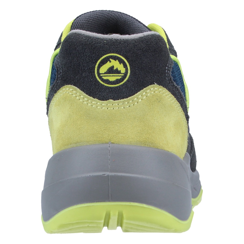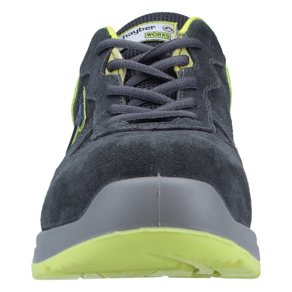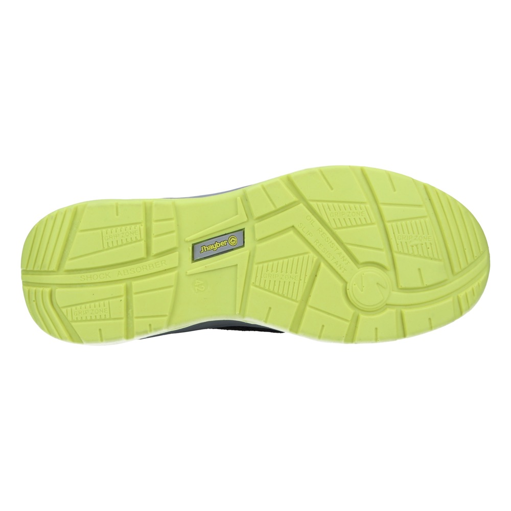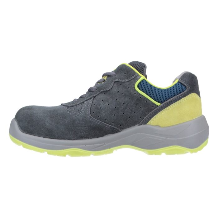 Calzado de seguridad gris con detalles en color lima, ligero y flexible, con horma ancha especial, lo que hace que sea un calzado cómodo para afrontar la jornada laboral. Su corte está realizado en serraje perforado y el forro interior es de rejilla de doble frontura, por lo que este modelo es ultra transpirable. La lengüeta acolchada protege el empeine ante golpes y rozaduras, y viene con fuelle incluido, para evitar la entrada de partículas en el interior. La puntera de este calzado es de fibra de vidrio, no es metálica, y la plantilla antiperforación. La suela está fabricada en poliuretano bidensidad. El modelo Cromo posee excelentes propiedades antideslizantes y antiestáticas. Este calzado es 100 % METAL FREE. Cumple la norma CE: EN ISO 20345:2011 Categoría: S1P