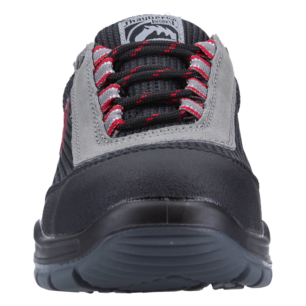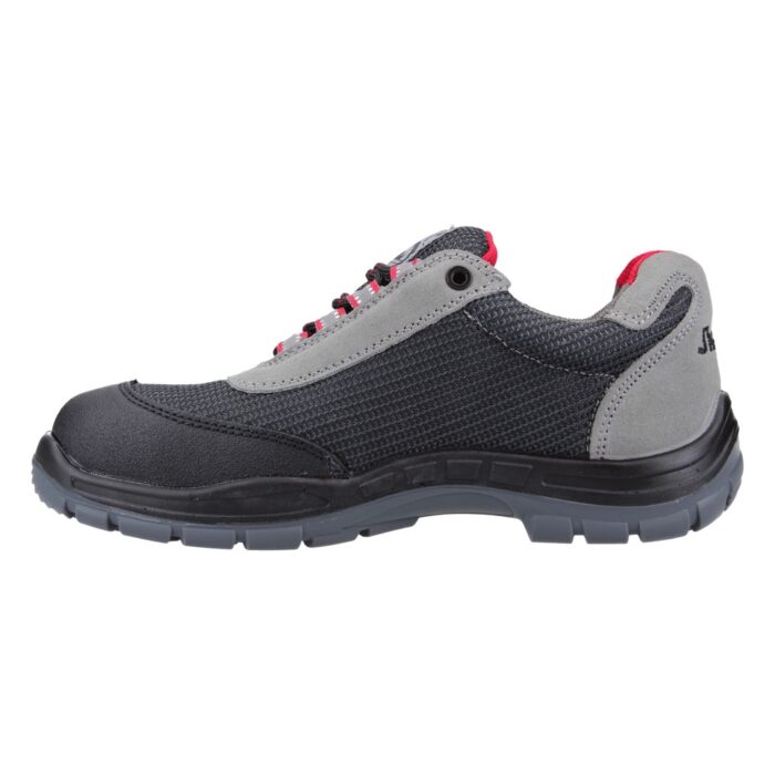 Zapato de seguridad Flexor gris de J’hayber Works. Calzado de seguridad gris con contrastes y detalles rojos, ligero y flexible, con un diseño deportivo. Su horma de ancho especial hace que sea un calzado cómodo para afrontar la jornada laboral. Su corte está realizado en serraje y rejilla, que junto al interior en rejilla de doble frontura, hace que sea un calzado ultra transpirable. La lengüeta acolchada protege el empeine ante golpes y rozaduras. La puntera de este calzado es de fibra de vidrio, resistente a 200 julios y la plantilla antiperforación no metálica incorpora la tecnología JHAYFLEX. Suela de inyección de PU + TPU. El modelo Flexor posee excelentes propiedades antideslizantes. Este calzado es 100 % METAL FREE. Cumple la norma CE: EN ISO 20345:2011Categoría: S1P SRC
