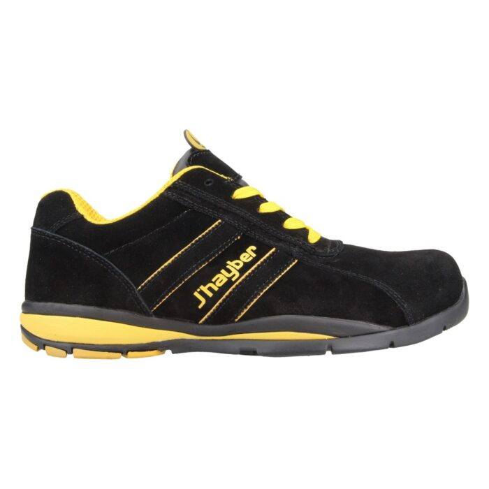 Zapato de seguridad Goal S1+P de J’hayber Works. Calzado de seguridad negro con detalles amarillos, ligero y flexible, con un diseño deportivo. Su corte está realizado en serraje y el interior en rejilla de doble frontura, para una mayor protección, a la vez que favorece la transpirabilidad. La lengüeta acolchada protege el empeine ante golpes y rozaduras. La puntera de este calzado es de fibra de vidrio, resistente a 200 julios y la plantilla antiperforación no metálica incorpora la tecnología JHAYFLEX. La suela está fabricada en caucho y Eva, resistente a 300ºC. Este calzado es 100 % METAL FREE. Cumple la norma CE: EN ISO 20345:2011 Categoría: S1P HRO SRC.