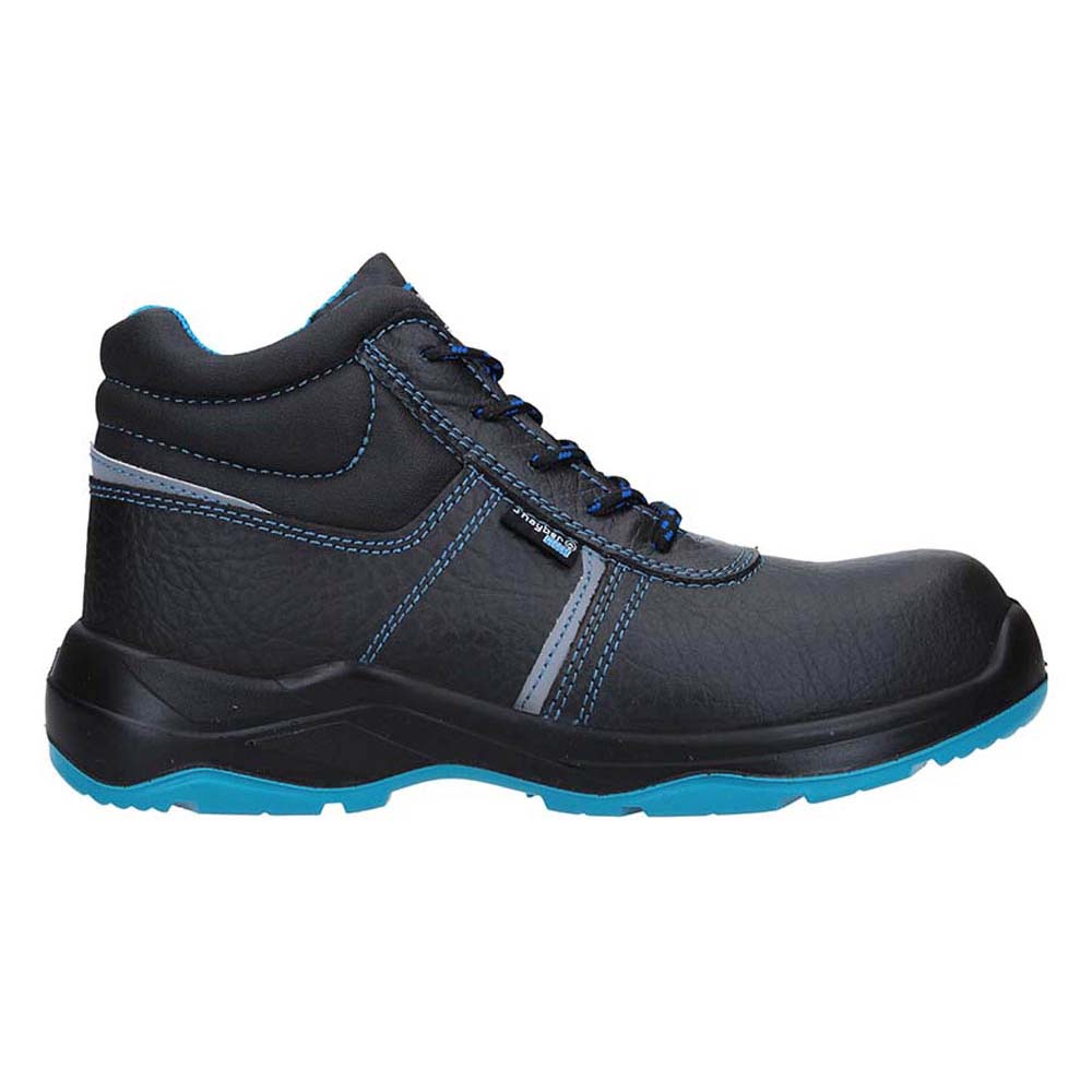 Bota de seguridad Grafeno negro de J’hayber Works. Calzado de seguridad negro con detalles azules, ligero y flexible, con horma ancha, lo que hace que sea un calzado cómodo para afrontar la jornada laboral. Su corte está realizado en piel flor, para una fácil limpieza, e incluye elementos reflectantes que mejoran la visibilidad del trabajador. El forro interior es de rejilla de doble frontura para una mayor transpirabilidad. La lengüeta acolchada protege el empeine ante golpes y rozaduras, y viene con fuelle incluido, para evitar la entrada de partículas en el interior. La puntera de este calzado es de fibra de vidrio, no es metálica, y la plantilla antiperforación. La suela está fabricada en poliuretano bidensidad. El modelo Grafeno posee excelentes propiedades antideslizantes y antiestáticas. Este calzado es 100 % METAL FREE. Cumple la norma CE: EN ISO 20345:2011 Categoría: S3 SRC