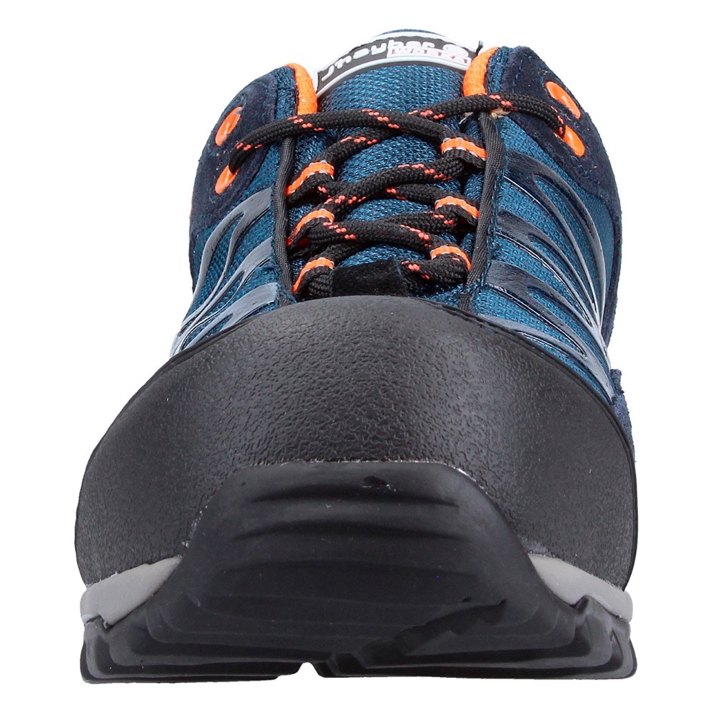 Zapato de seguridad Grip azul de J’hayber Works. Calzado de seguridad azul con detalles naranja y negros, ligero y flexible, con un diseño deportivo. Su corte está realizado en serraje y nylon, con un diseño original, y el interior en rejilla de alta resistencia, que además de ser transpirable, garantiza la seguridad del pie. La lengüeta acolchada protege el empeine ante golpes y rozaduras. La puntera de este calzado es de fibra de vidrio, resistente a 200 julios y la plantilla antiperforación no metálica incorpora la tecnología JHAYFLEX. La suela está fabricada en caucho y Eva, resistente a 300ºC. Este calzado es 100 % METAL FREE. Cumple la norma CE: EN ISO 20345:2011 Categoría: S1P HRO SRC.