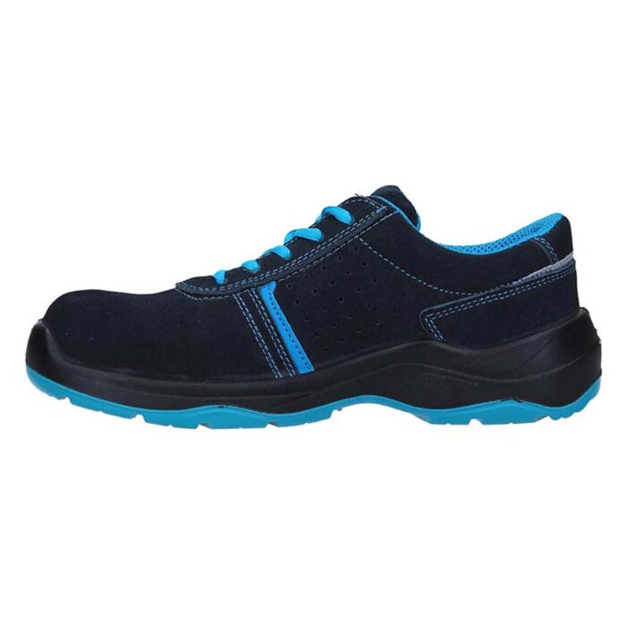 Zapato de seguridad Osmio marino de J’hayber Works. Calzado de seguridad marino con detalles azules, ligero y flexible, con horma ancha, lo que hace que sea un calzado cómodo para afrontar la jornada laboral. Su corte está realizado en serraje perforado y el forro interior es de rejilla de doble frontura, por lo que este modelo es ultra transpirable. Lleva incorporados elementos reflectantes que mejoran la visibilidad del trabajador. La lengüeta acolchada protege el empeine ante golpes y rozaduras, y viene con fuelle incluido, para evitar la entrada de partículas en el interior. La puntera de este calzado es de fibra de vidrio, no es metálica, y la plantilla antiperforación. La suela está fabricada en poliuretano bidensidad. El modelo Osmio posee excelentes propiedades antideslizantes y antiestáticas. Este calzado es 100 % METAL FREE. Cumple la norma CE: EN ISO 20345:2011 Categoría: S1P SR.