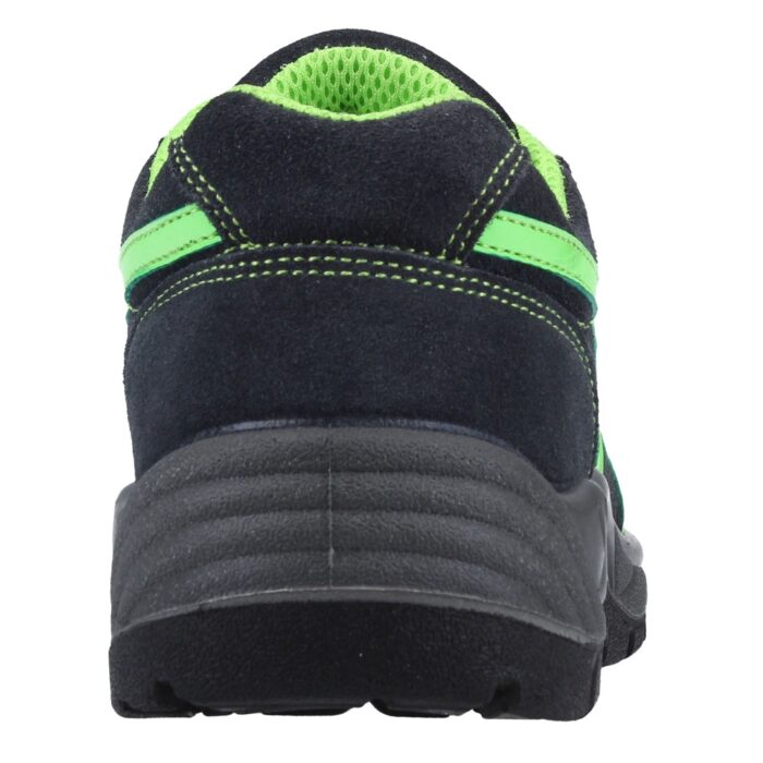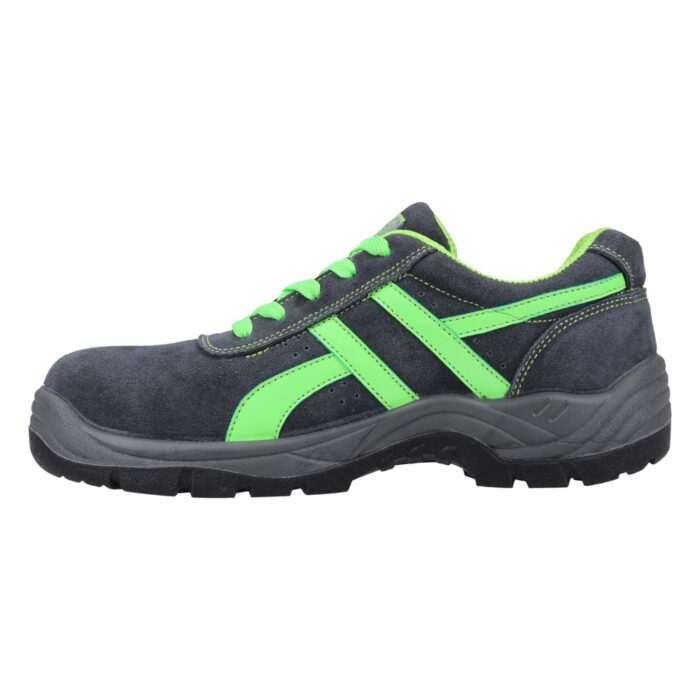 Zapato de seguridad Titanio gris de J’hayber Works. Calzado de seguridad gris con detalles verdes, ligero y flexible, con horma ancha, lo que hace que sea un calzado cómodo para afrontar la jornada laboral. Su corte está realizado en serraje perforado y el forro interior es de rejilla de doble frontura, por lo que este modelo es ultra transpirable. La lengüeta acolchada protege el empeine ante golpes y rozaduras, y viene con fuelle incluido, para evitar la entrada de partículas en el interior. La puntera de este calzado es de fibra de vidrio, no es metálica, y la plantilla antiperforación. La suela está fabricada en poliuretano bidensidad. El modelo Titanio posee excelentes propiedades antideslizantes y antiestáticas. Este calzado es 100 % METAL FREE. Cumple la norma CE: EN ISO 20345:2011 Categoría: S1P SR.