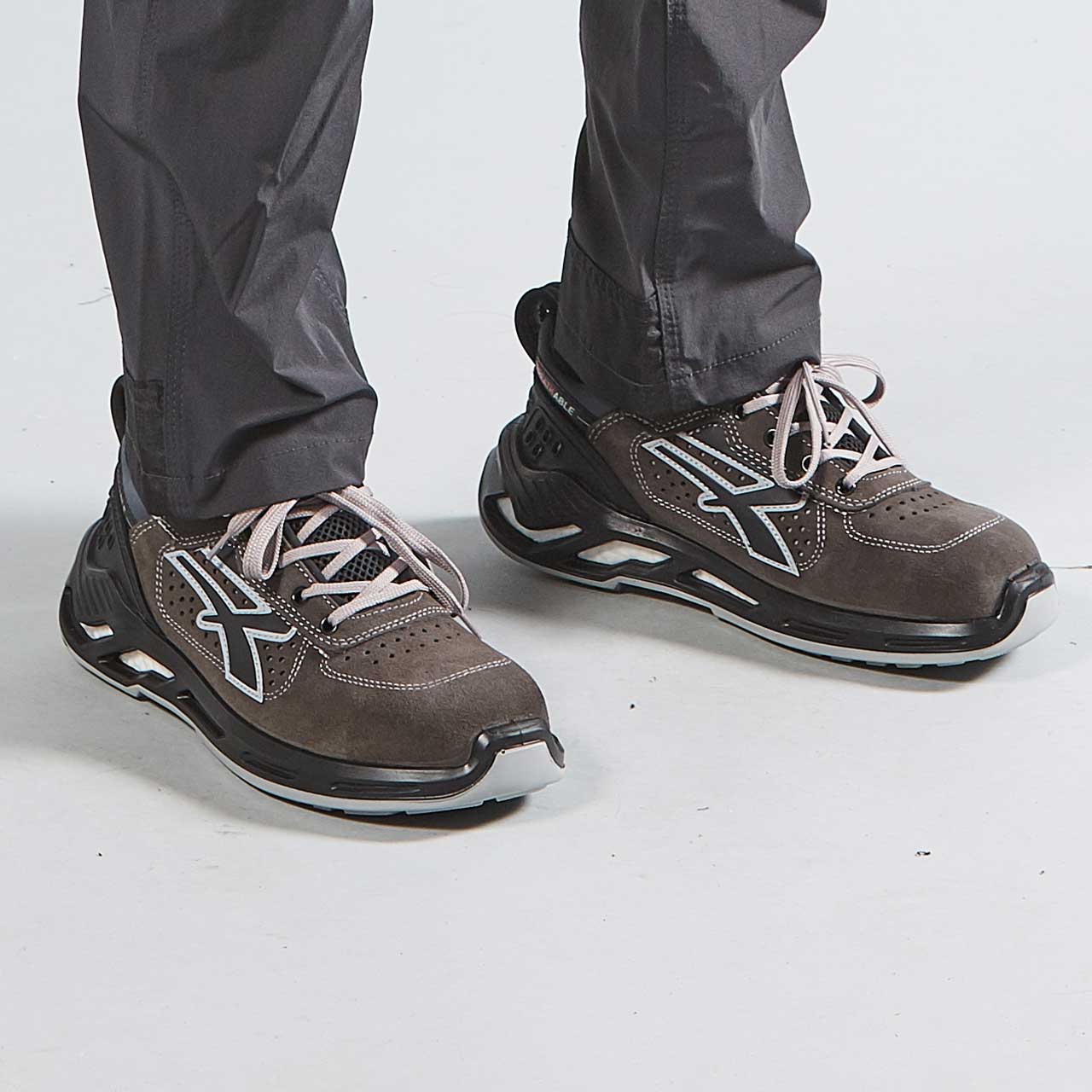 Zapatos de seguridad bajos, ligeros y cómodos U-Power de la línea Red 360, con parte superior en suave piel afelpada perforada, collarín con tejido de fibra Lycra® y escudo anti- impactos en el talón, puntera de aluminio, antiarrugas, antideslizante y suela de poliuretano PU / PU, S1P SRC ESD