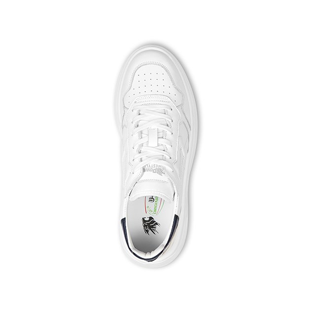 La parte superior de cuero blanco suave y los detalles azules hacen que esta sneaker sea adecuada para cualquier ocasión.
