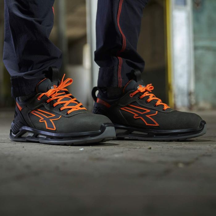 Zapatos de seguridad bajos, ligeros y cómodos U-Power de la línea Red 360, con parte superior en piel nobuck natural tratado hidrorepelente, collarín con tejido de fibra Lycra® y escudo anti-impactos en el talón, puntera de aluminio, antiarrugas, antideslizante y suela de poliuretano PU / PU, S3 SRC CI ESD