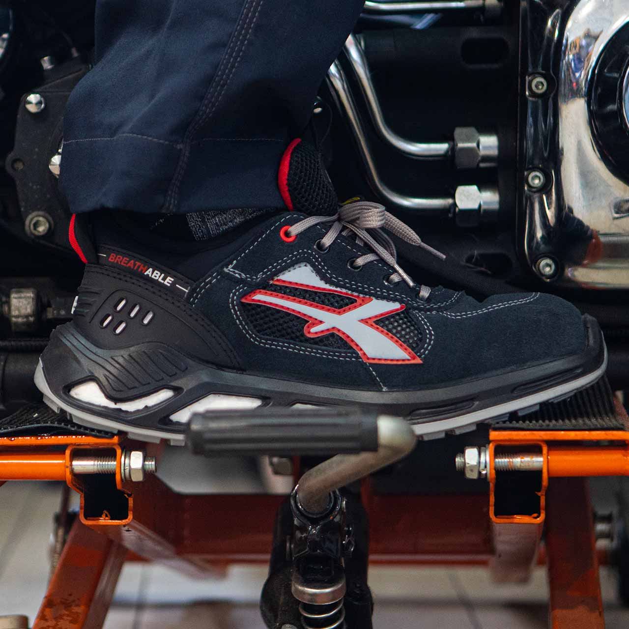 Zapatos de seguridad bajos, ligeros y cómodos U-Power de la línea Red 360, con parte superior de nailon ultraflexible y gamuza suave, collarín con tejido de fibra Lycra®, escudo anti- impactos en el talón, puntera de aluminio, antiarrugas, antideslizante y suela de poliuretano PU / PU, S1P SRC ESD