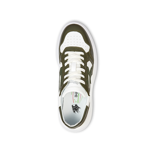 Esta sneaker antideslizante con parte superior, plantilla y lengüeta de cuero blanco suave se realza con los fondos de microfibra verde.