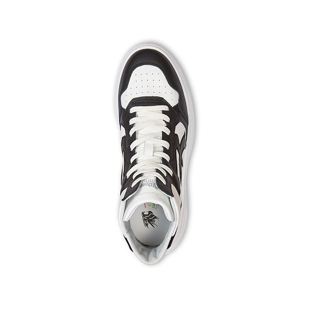 Este modelo destaca por su parte superior, plantilla y lengüeta realizados en piel blanca, embellecidos por los lazos negros de microfibra que realzan su estilo.