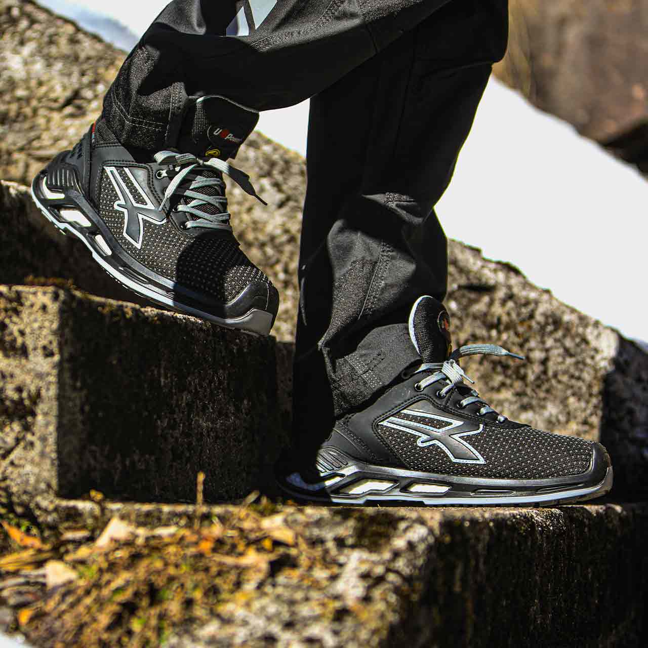 Zapatos de seguridad altos, ligeros y cómodos U-Power de la línea Red 360, con parte superior en PUTEK® star con altisima resistencia a la abrasion, impermeable y transpirable, escudo anti-impactos en el talón. Refuerzo en PU en puntera, puntera de aluminio, antiarrugas, antideslizante y suela de poliuretano PU / PU, S3 SRC CI ESD