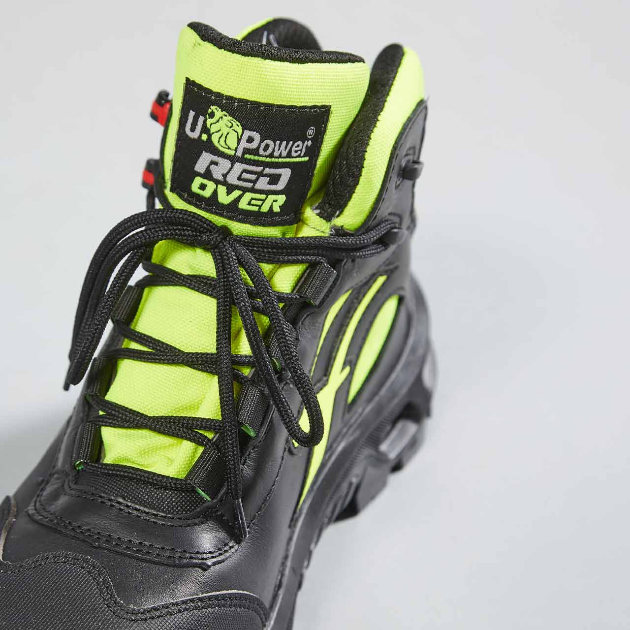Zapato de seguridad alto y cómodo, de la línea Red Over de U-Power, parte superior en cuero de grano suave, inserciones textiles y puntera en compuesto, forro Gore-Tex y suela en espuma de PU suave e Infinergy®.