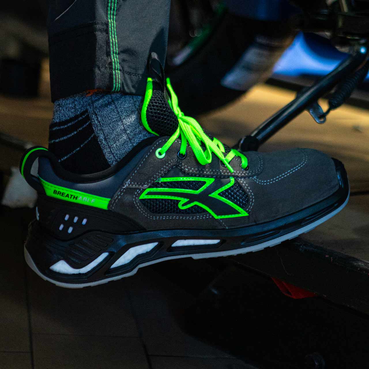 Zapatos de seguridad bajos, ligeros y cómodos U-Power de la línea Red 360, con parte superior de nailon ultraflexible y gamuza suave, collarín con tejido de fibra Lycra®, escudo anti- impactos en el talón, puntera de aluminio, antiarrugas, antideslizante y suela de poliuretano PU / PU, S1P SRC ESD