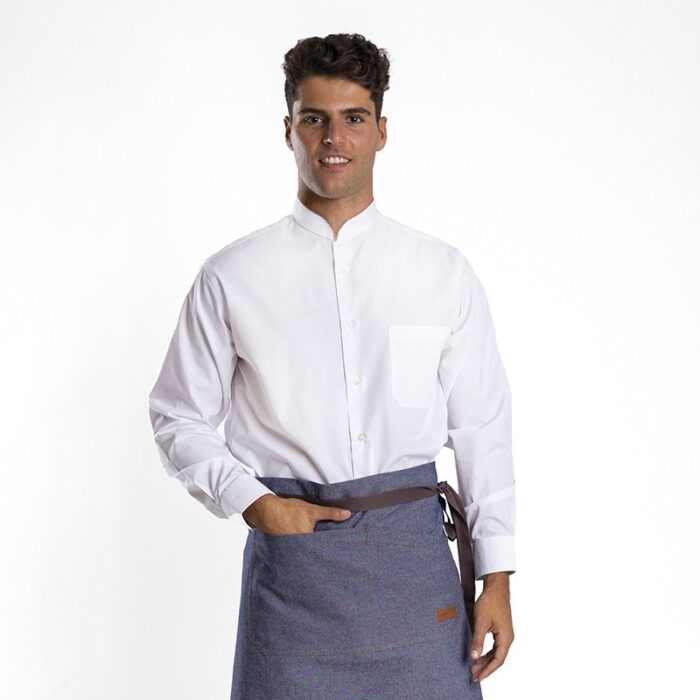 Camisa de hombre de manga larga con cuello mao tipo chino y bolsillo en pecho izquierdo. Doble ojal para gemelo, 2 botones para ajuste de puño, costura francesa en sisa y cargadas en costados. Es una camisa laboral de gran calidad ideal para combinar con tu ropa de hosteleria para camarero, servicio de sala, cafeterias. Elegante y moderna. Composición: 65%poliéster, 35%algodón. 116gr.