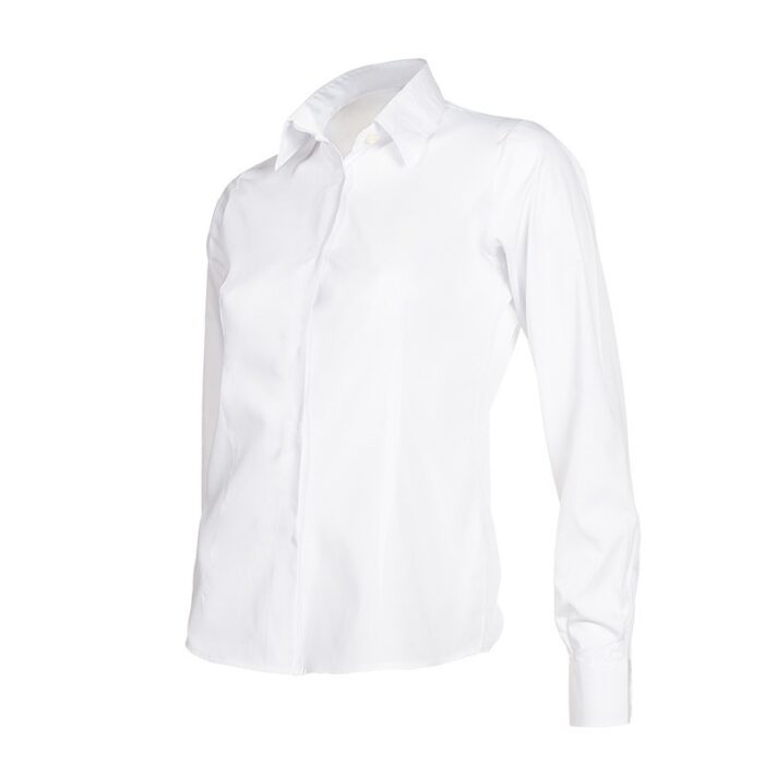 Cómoda blusa elástica femenina de estilo muy actual y corte semiajustado imprescindible para tu armario. Con tejido resistente y de alto porcentaje en algodón. De manga larga y sin bolsillos. Cuello camisero sin botón. Puños con cierre de dos botones y cierre frontal de botones ocultos. Con acabado fácil planchado y muy fácil de llevar. Combinable y adaptable a todos los estilos y uniformes de trabajo. Si buscas un uniforme moderno para camareras, cafeterias, recepcionistas, azafatas esta camisa de vestir destaca por su diseño cómodo y moderno. Son camisas perfectas también para llevar al trabajo y la oficina. Composición: 75% algodón, 20% poliéster, 2% spandex. Gramaje 110gr.