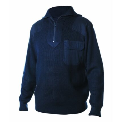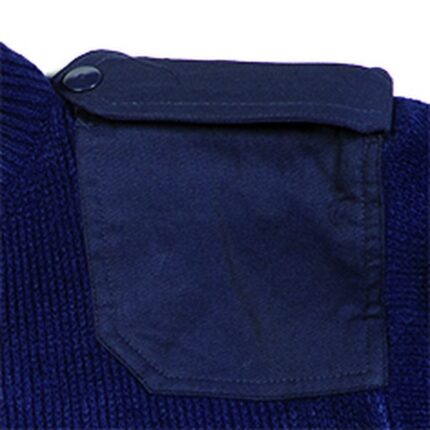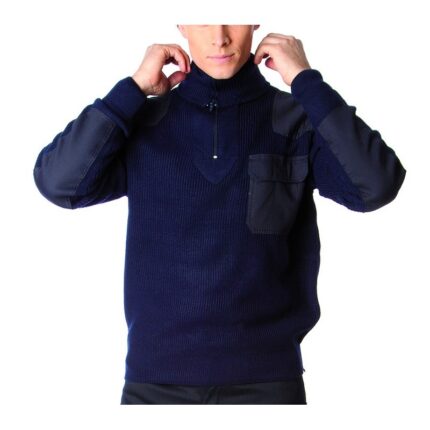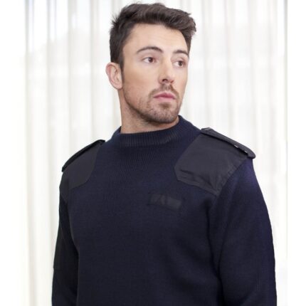 Jersey unisex, cuello caja, charretera desmontable, porta chapas, porta bolígrafos, refuerzos en codos y hombros. Composición: 100% acrilico, punto doble