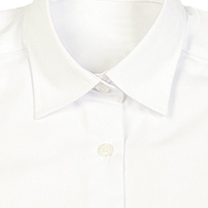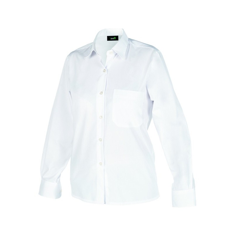 Camisa blanca manga larga de mujer. De corte holgado que la hace comodisima y bolsillo en pecho izquierdo. Es una elegante camisa blanca de cuello camisero sin botón y cierre central con tapeta. De cuidado fácil. Resistente, con costuras cargadas, transpirable y de tejido agradable de tacto suave. Composición: 65%poliéster, 35% algodón. 116gr.