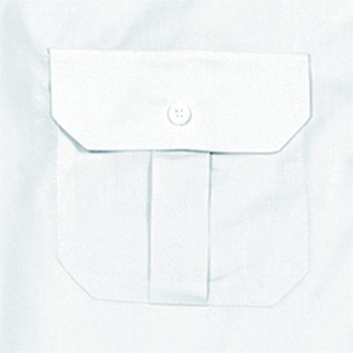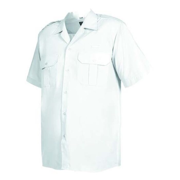 Camisa unisex de manga corta y cuello regulable. Con charreteras, tablón en la espalda, bolsillos con fuelles y tapetas y portachapas. Composición: 65%poliéster, 35% algodón