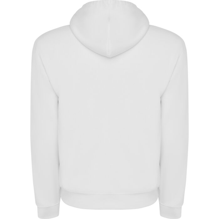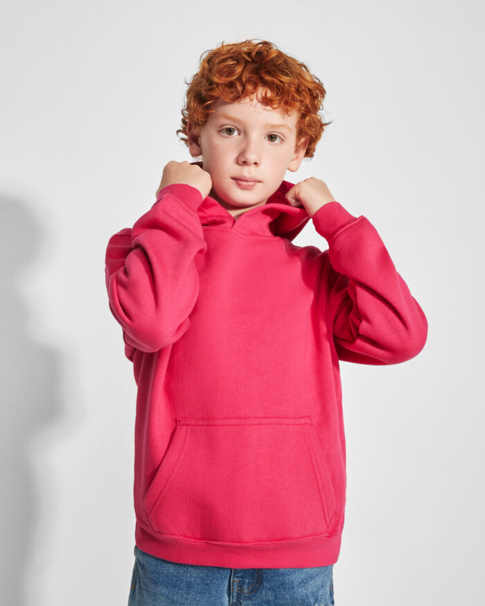Sudadera capucha con bolsillo canguro y cordón plano ajustable. Puños y cinturilla con punto canalé 1×1 con elastano. Modelo de niño sin cordón.