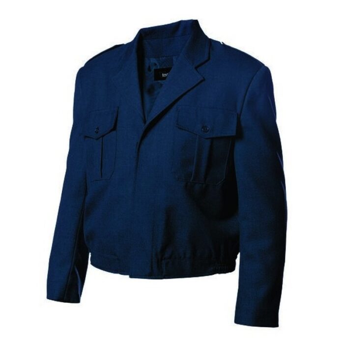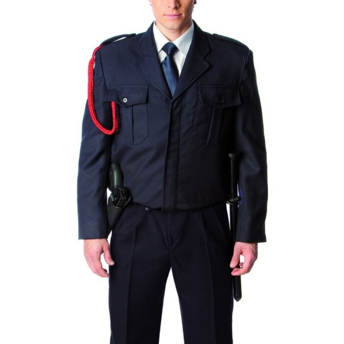 Cazadora vigilante unisex, con solapas y charreteras, 2 bolsillos con tapetas y fuelle, espalda con fuelles laterales. Composición:65% polyester, 35% lana grammage 385gr / ml