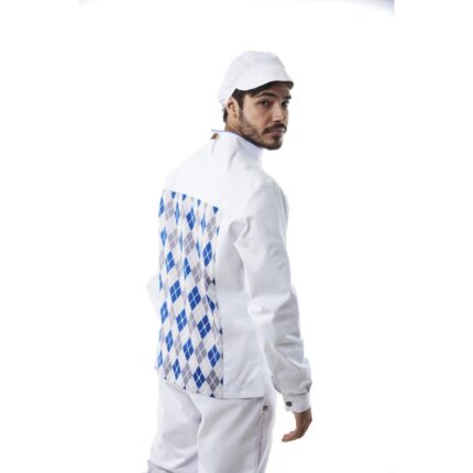 Chaquetilla de cocina con tejido gabardina elástica, con estampado de molinillos, mangas rollup y sujetadelantal. Tiene la espalda transpirable en