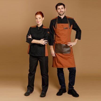 Delantal peto de atractivo diseño y aspecto premium. Con bolsillo en pecho con cinta decorativa. Espalda cruzada con cintas de
