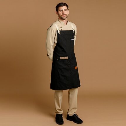 Delantal peto de atractivo diseño y aspecto premium. Con bolsillo en pecho con cinta decorativa. Espalda cruzada con cintas de