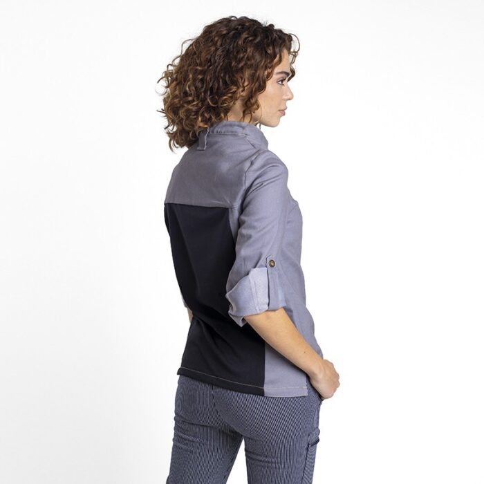 Original chaquetilla de cocina de mujer, de corte entallado y confeccionada en moderno tejido denim elástico muy resistente, duradero y de tacto agradable. Con elegante diseño en cuello mao y cómoda manga larga con roll-up convertible en manga corta. Cierre asimétrico con botones automáticos a presión, ocultos, antioxidables y sin contacto con piel. Espalda transpirable completa con tejido técnico ligero estilo coolmax, que además aporta mayor elasticidad. Varios detalles en cuero y funcionalidad de sujeta-delantal en el cuello para descanso de nuca.