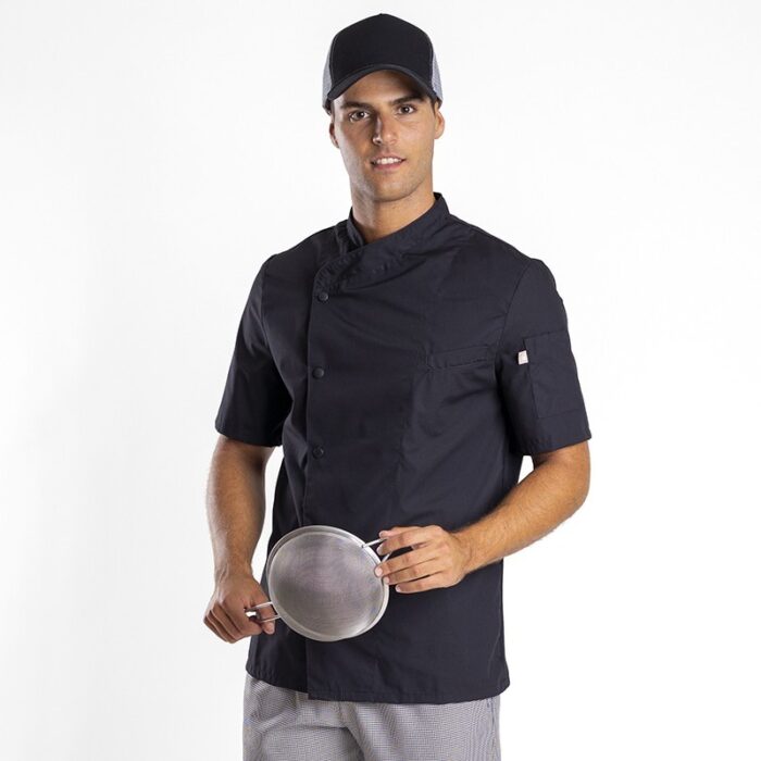 Chaquetilla de cocinero, manga corta, botones de corchete “no contacto con piel”. Bolsillo en pecho y brazo izquierdo. Tejido técnico transpirable y elástico en costadillos. Composición popelín 65%poliéster, 35%algodón. 140gr. Tejido técnico transpirable 100%poliéster, 130gr.