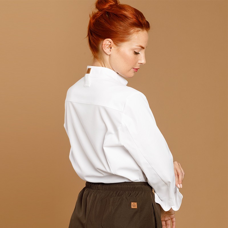 Chaquetilla moderna de cocina y sala de mujer de cuello mao y manga larga con puño. Confeccionada en microfibra primesoft. De diseño limpio y moderno. Con dos bolsillos de ribete insertados en el pecho y un bolsillo en manga izquierda. Tejido extra suave que se adapta perfectamente al cuerpo y permite gran libertad de movimiento. Tejido técnico elástico transpirable en espalda. Con cierre mediante hilera de corchetes ocultos.