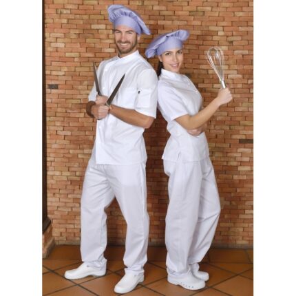 Chaquetilla de cocinero, manga corta, botones de corchete “no contacto con piel”. Bolsillo en pecho y brazo izquierdo. Tejido técnico