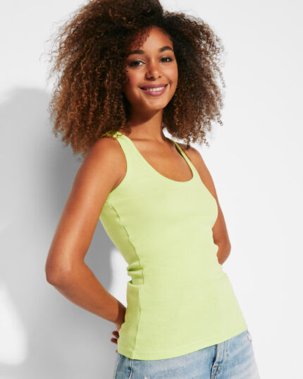Camiseta entallada, con sisas y escote ribeteado, ancho y enrollado. Espalda estilo nadadora y costuras laterales.Composición: 100% algodón, canalé 1×1,