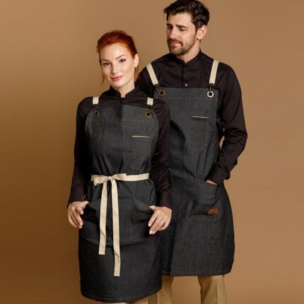 Delantal medio o corto, tipo denim vaquero con bolsillo central de corte asimétrico y cintas de espiga de algodón. Con