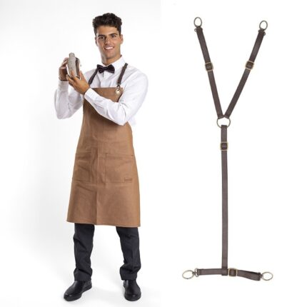 Arnés de cinta polipiel para delantal, talla única pero ajustable, efecto cuero y enganches oro viejo. Aspecto elegante y adaptación