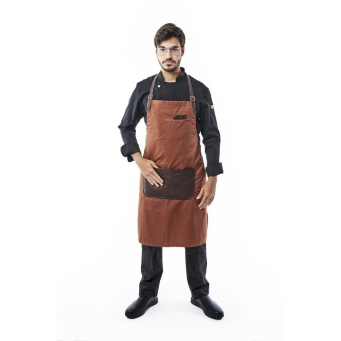 Delantal de peto combinado con polipiel, gabardina. Incluye bolsillo polipiel grabado dividido en dos y otro en pecho,cinta desmontable de polipiel para ajustarlo al cuello con hebillas de oro viejo. Delantal de uso polivalente, tanto en cocina, sala como otros usos incluso externos a la restauración. Composición: 65% poliéster, 35% algodón. Disponible en colores: kaki, caldero, verde y azul.