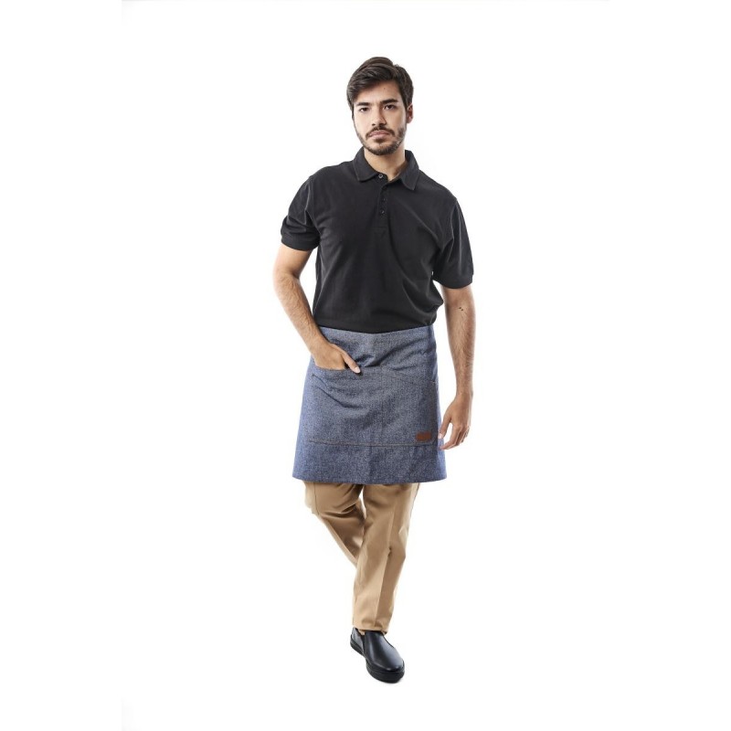 Delantal medio o corto, tipo denim vaquero con bolsillo central en ante de corte asimétrico y cintas de espiga de algodón. Composición: 85% algodón, 15% poliéster.