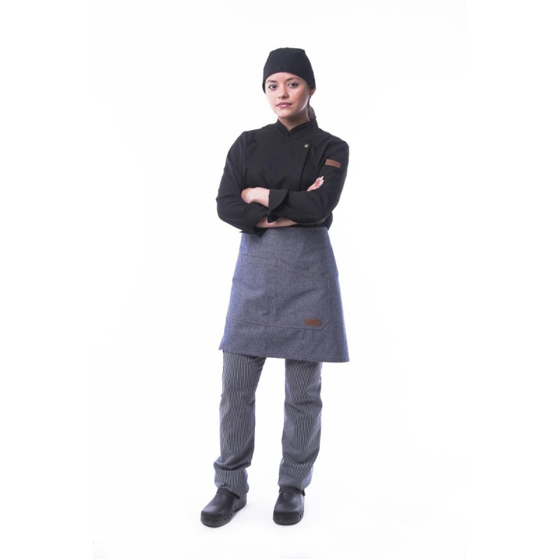Moderna chaquetilla de cocina para mujer de gran calidad. Confeccionada en tejido denim elástico muy resistente, duradero y de tacto