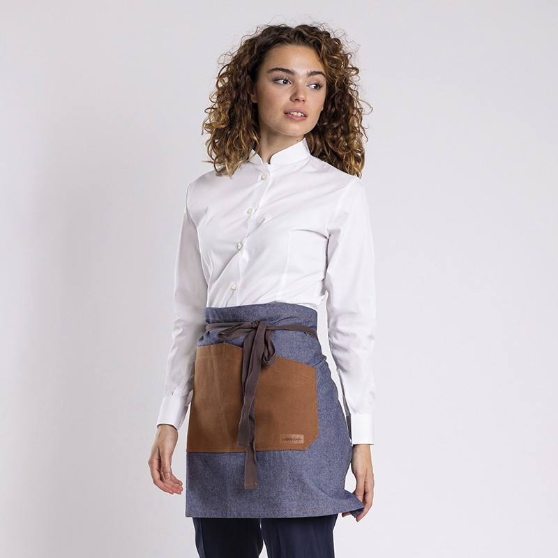 Delantal medio o corto, tipo denim vaquero con bolsillo central de corte asimétrico y cintas de espiga de algodón. Con suede o ante. Composición: 85% algodón, 15% poliéster.