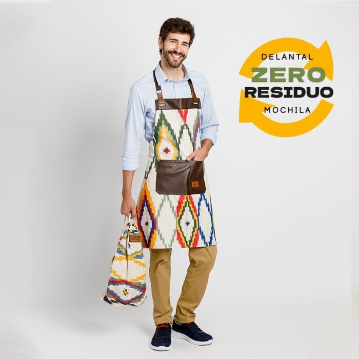 Delantal moderno de cocina para profesionales masterchef. Es un delantal práctico y bonito. Inigualable, muy resistente y duradero. Ideal para regalar. Con bolsillo central doble y banda en el pecho en polipiel. Perfecto para el personal de hostelería de cocina y de sala. Todo lo que necesitas para transmitir tu mejor imagen corporativa. *este delantal es un delantal residuo zero. Se ha producido sin desperdicio textil. La mochila que acompaña a este delantal se ha generado con el tejido sobrante en su proceso de elaboración.