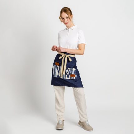 Delantal peto de atractivo diseño y aspecto premium. Con bolsillo en pecho con cinta decorativa. Espalda cruzada con cintas de