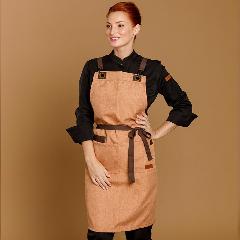 Delantal de peto con tejido de imitación lino, con un bolsillo grande en la parte central inferior, espalda cruzada con tirantes ajustables y cintas cruzadas. Detalles en cuero. Muy ligero y fresco. Apto para distintos usos en hostelería y fuera del sector. Composición: 100% poliéster.