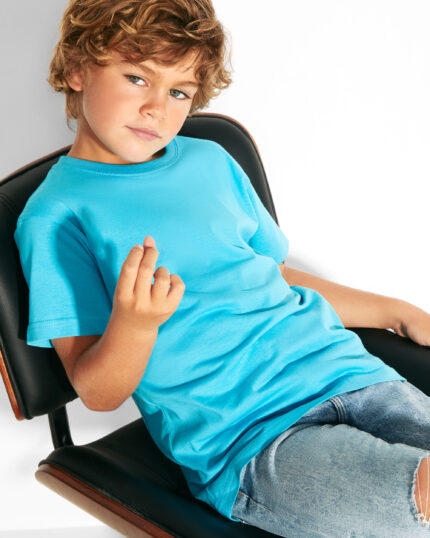 Camiseta de manga corta tubular con acabado vigoré. Cuello redondo en punto canalé 1×1 con cubre costuras interior.Composición: 65% poliéster