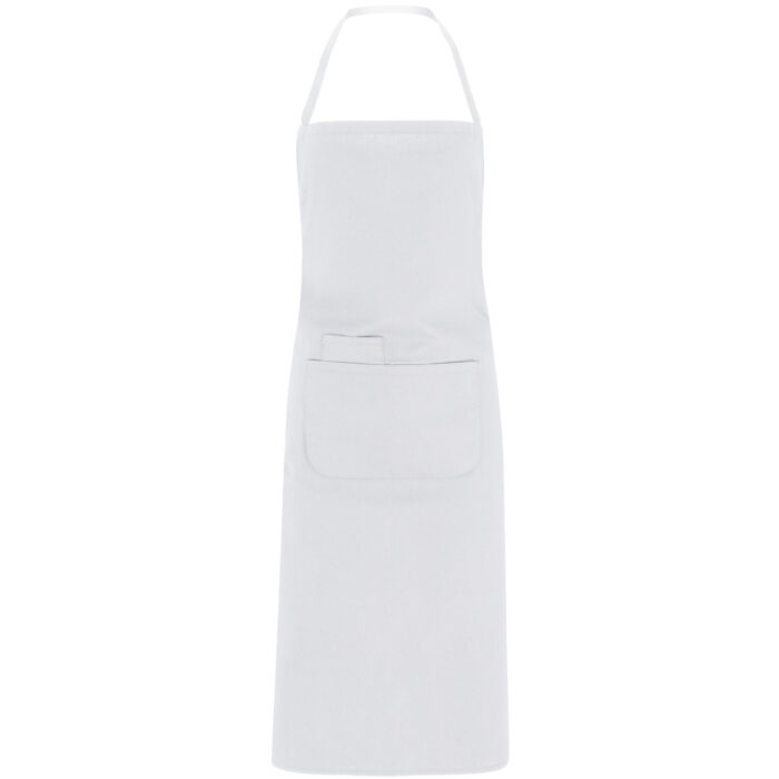 Delantal largo de sarga. · Tirante con cierre ajustador de plástico. · Cintas laterales para lazada. · Bolsillo frontal con